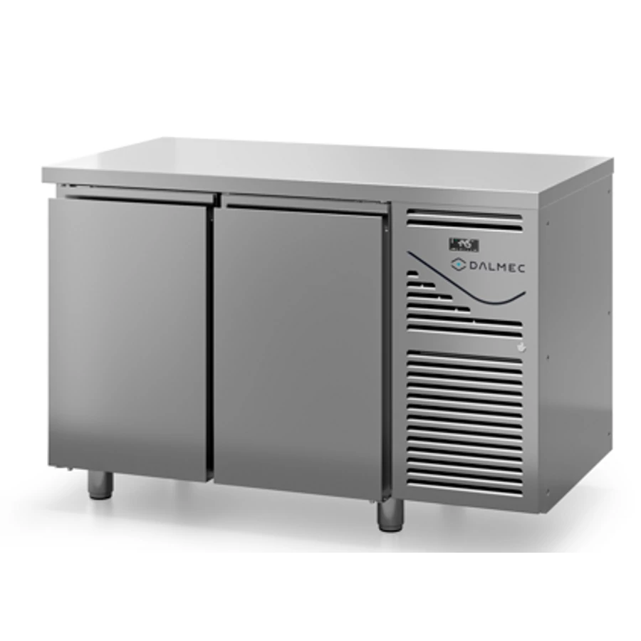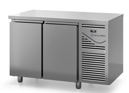 A Dalmec olasz gyártmányú, professzionális nagykonyhai, 231 literes, 2 ajtós, GN 1/1-es ráccsal és polccal rendelkező hűtött munkaasztal kívül belül rozsdamentes acél borítással rendelkezik, és trópusi kivitelű, könnyen szerelhető, monobloc rendszerű aggregáttal működik, nincs hátsó felhajtás.