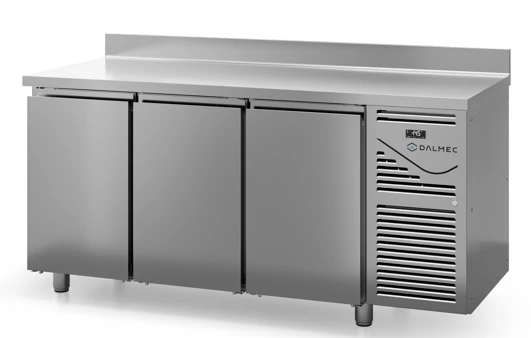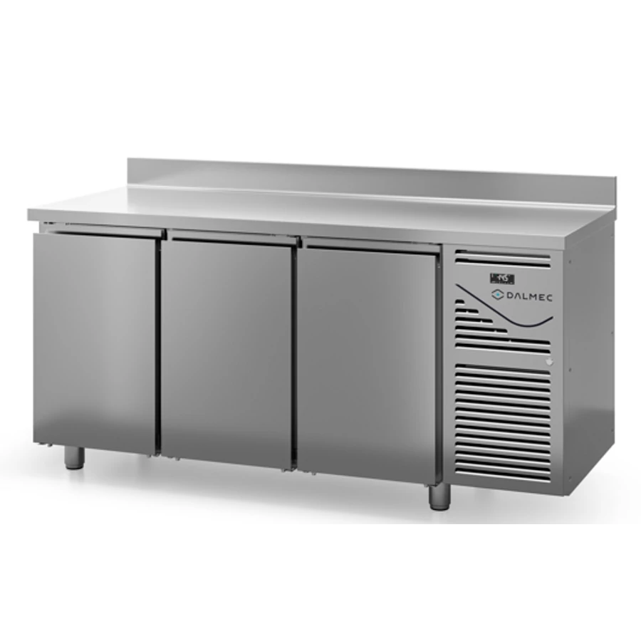 A Dalmec olasz gyártmányú, professzionális nagykonyhai, 393 literes, 3 ajtós, GN 1/1-es ráccsal és polccal rendelkező hűtött munkaasztal kívül belül rozsdamentes acél borítással rendelkezik és trópusi kivitelű, könnyen szerelhető, monobloc rendszerű aggregáttal működik, felhajtással.