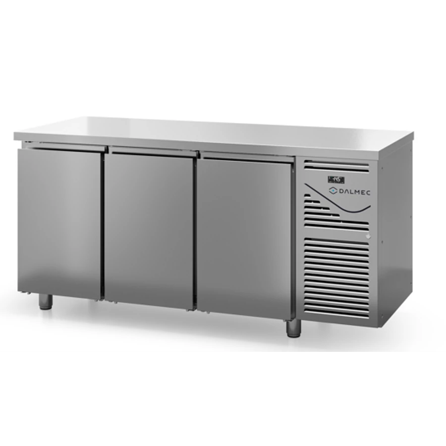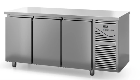 A Dalmec olasz gyártmányú, professzionális nagykonyhai, 393 literes, 3 ajtós, GN 1/1-es ráccsal és polccal rendelkező hűtött munkaasztal kívül belül rozsdamentes acél borítással rendelkezik és trópusi kivitelű, könnyen szerelhető, monobloc rendszerű aggregáttal működik, nincs hátsó felhajtás.