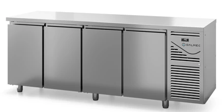 A Dalmec olasz gyártmányú, professzionális nagykonyhai, 530 literes, 4 ajtós, GN 1/1-es ráccsal és polccal rendelkező hűtött munkaasztal kívül belül rozsdamentes acél borítással rendelkezik és trópusi kivitelű, könnyen szerelhető, monobloc rendszerű aggregáttal működik, nincs hátsó felhajtás.